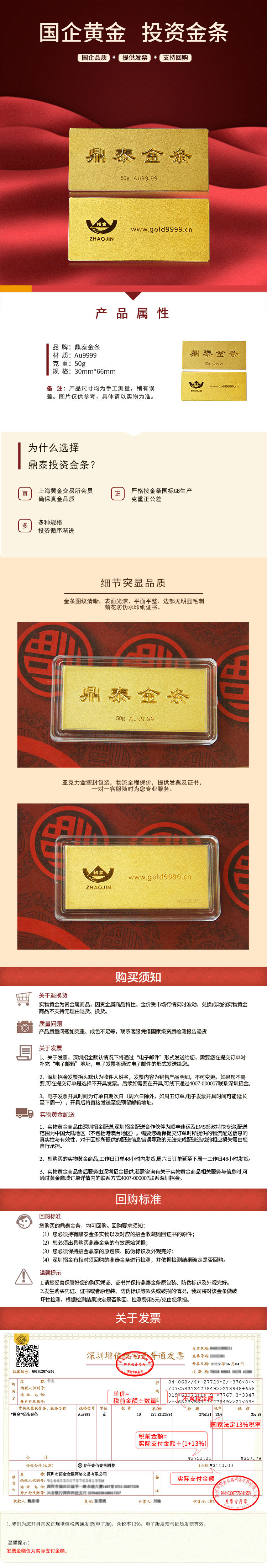 招金 Au9999鼎泰投資金條50克 投資保值收藏